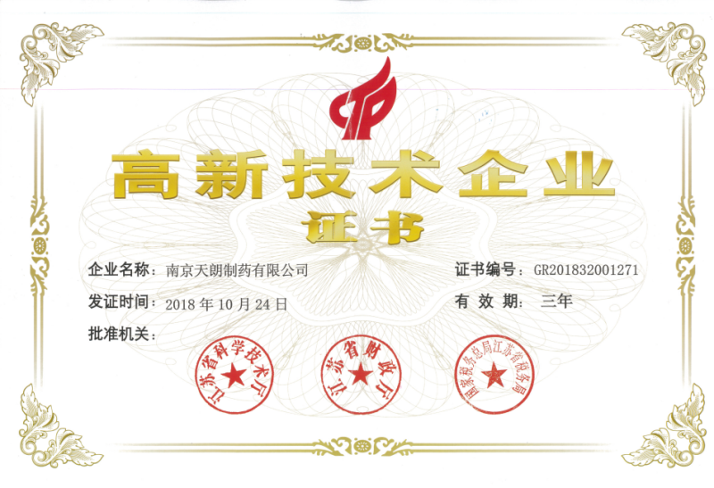 热烈庆祝南京天朗制药有限公司顺利通过高新技术企业认定